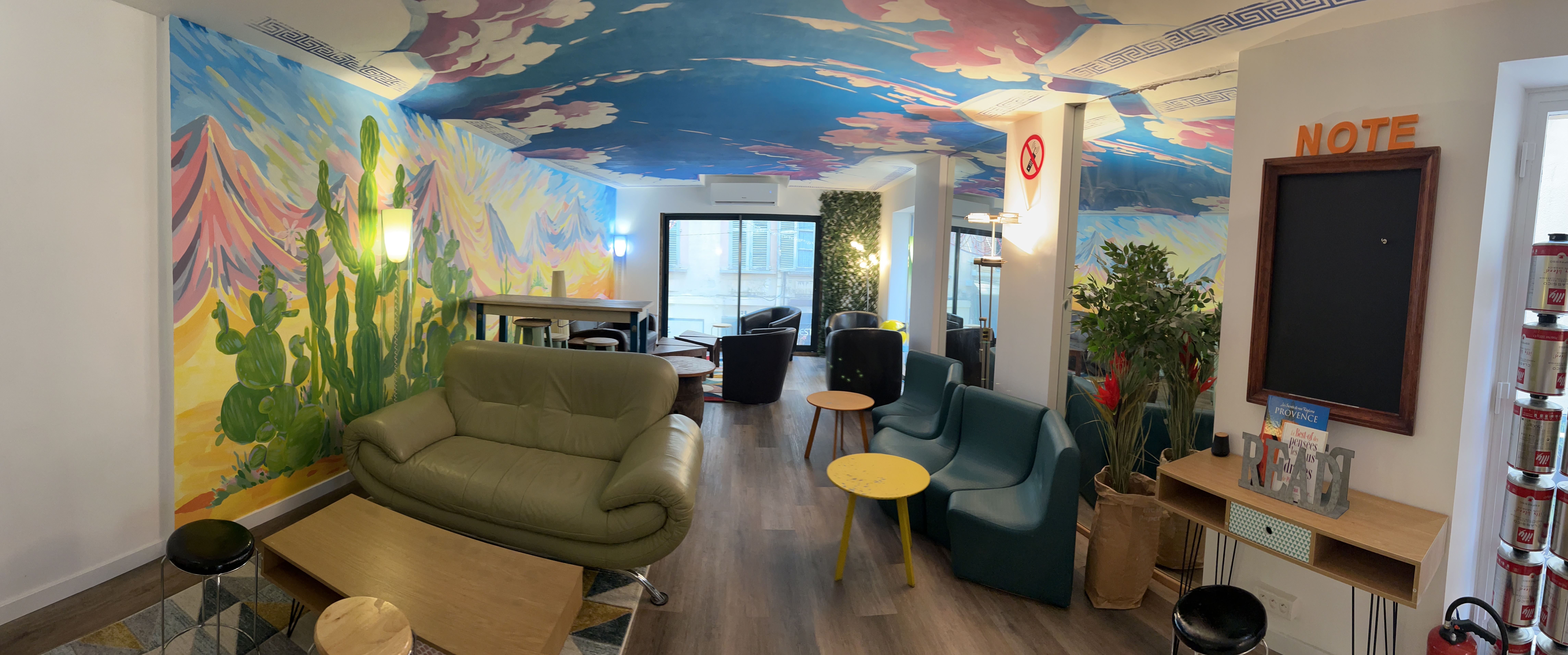 Ob Freiberufler, Telearbeiter, Studenten oder einfach nur Menschen, die einen Moment der Entspannung oder einen ruhigen Ort suchen, um ihre Projekte voranzutreiben - dieser Raum wurde so konzipiert, dass er Ihre Konzentration fördert und gleichzeitig den Austausch untereinander unterstützt. Diese warme und freundliche Umgebung verfügt im Obergeschoss auch über einen Coworking-Bereich, der bis zu 20 Personen aufnehmen kann.