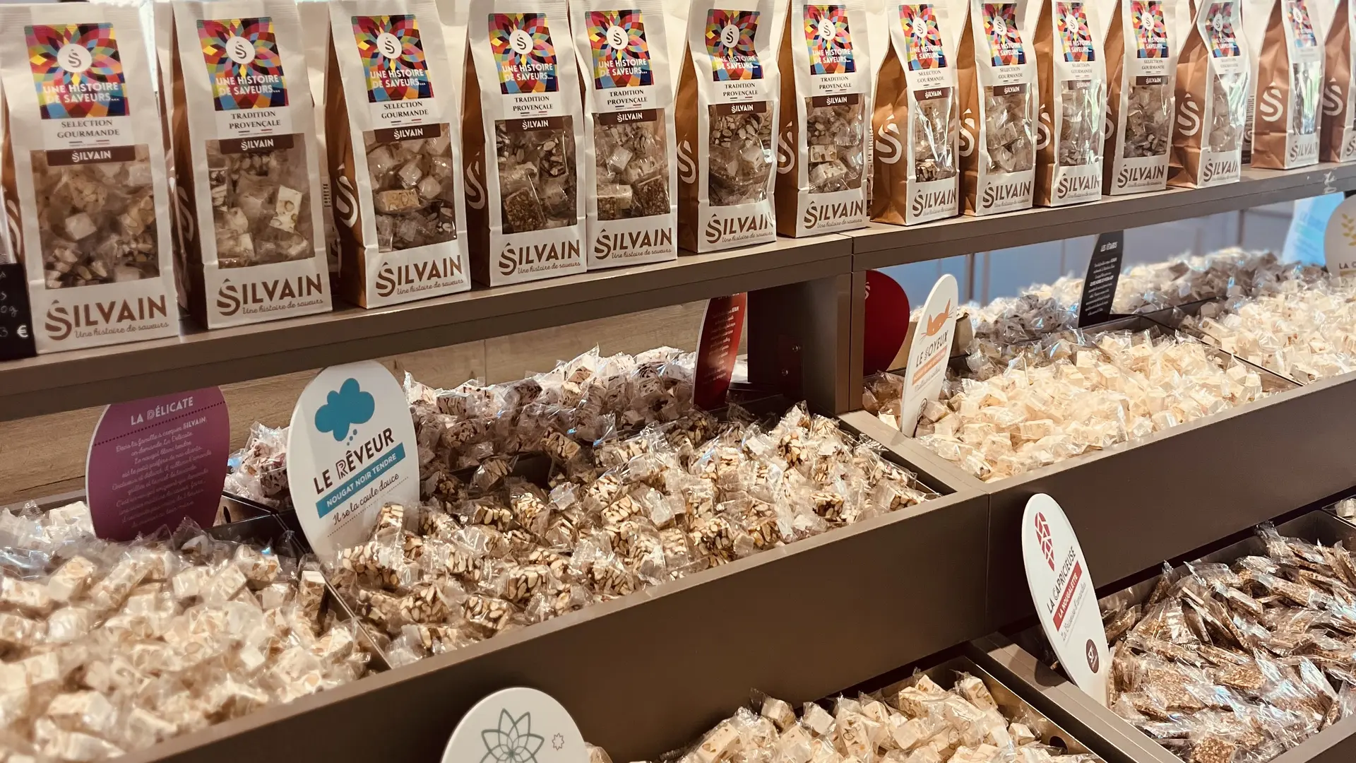 La famiglia SILVAIN vi dà il benvenuto nel suo torronificio, che ha ottenuto il marchio Entreprise du Patrimoine Vivant (Azienda del Patrimonio Vivente), dove lavora in squadra per produrre torroni, calissons, biscotti e torte che sublimano le mandorle, il miele e il meglio della regione provenzale. Discendente da una stirpe di agricoltori, la famiglia SILVAIN produce mandorle e miele di lavanda collaborando con gli agricoltori della regione. Venite a fare una pausa rinfrescante nel cuore dell'incantevole villaggio di Saint-Didier intorno alla gelateria e al nostro banco dolci.