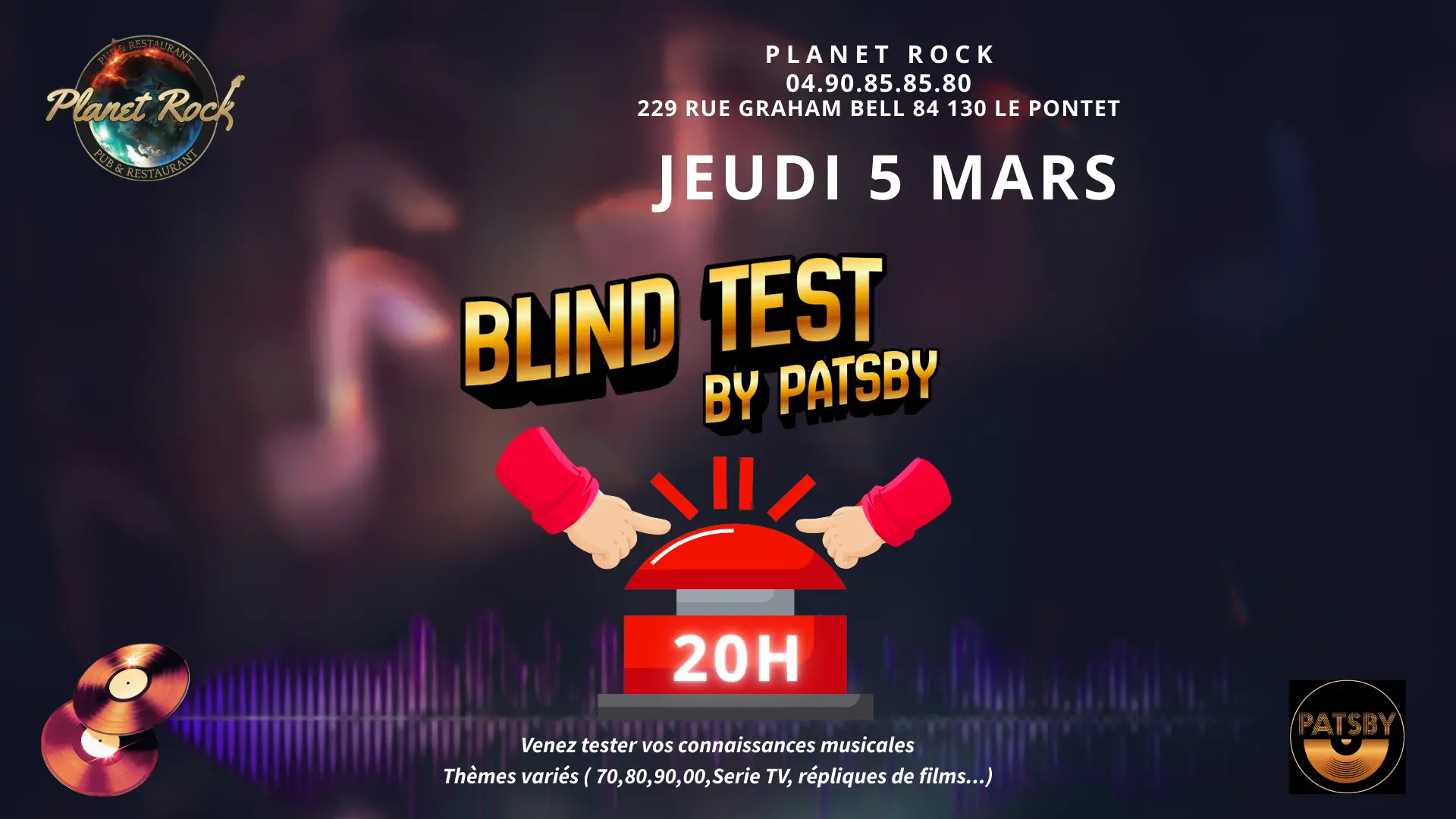 Prépare tes oreilles… et ton esprit de compétition. Blind Test avec patsbydj. En équipe ou en solo, viens tester ta culture musicale. Une ambiance qui monte à chaque morceau.