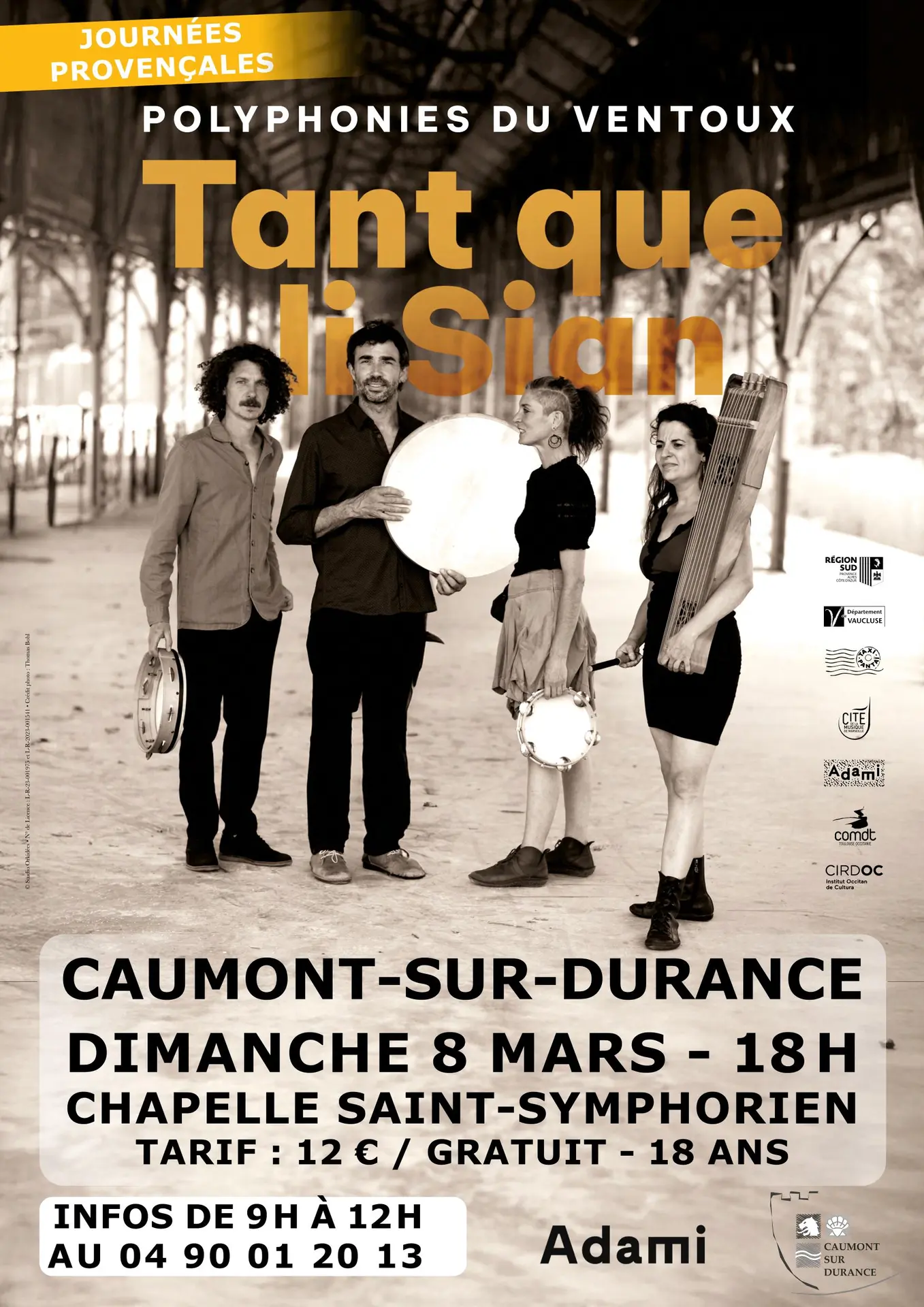 «Tant que li Sian» quatuor polyphonique présente un répertoire original de poèmes populaires provençaux collectés autour du Ventoux et en Provence, et mis en musique dans une formule associant recherche vocale, percussions corporelles et méditerranéennes.