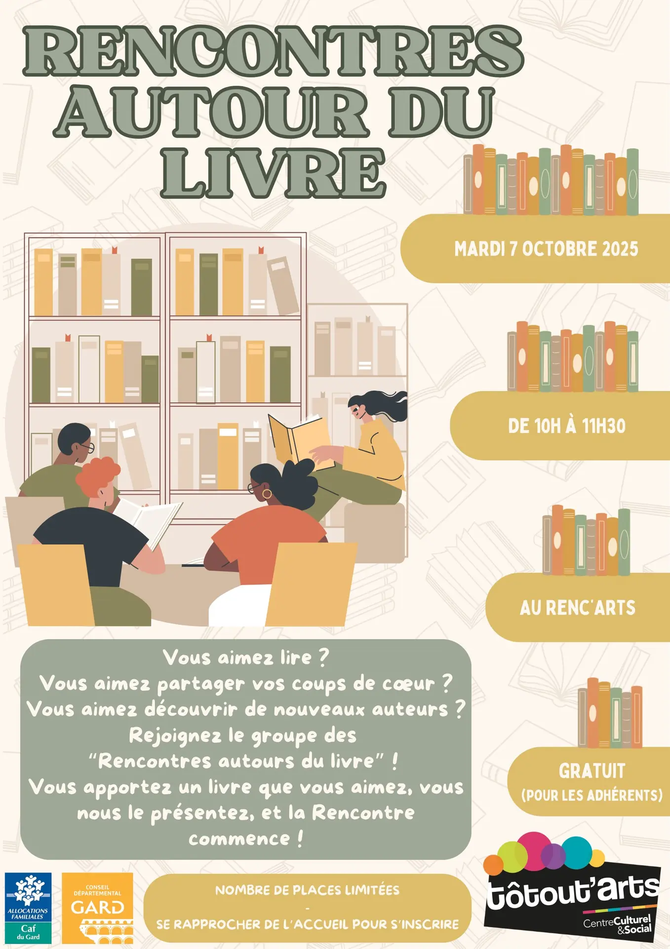 Vous aimez lire ? Vous aimez partager vos coups de coeur ? Vous aimez découvrir de nouveaux auteurs ? Rejoignez le groupe des « Rencontres autour du livre » ! Vous apportez un livre que vous aimez, vous nous le présentez et la rencontre commence !