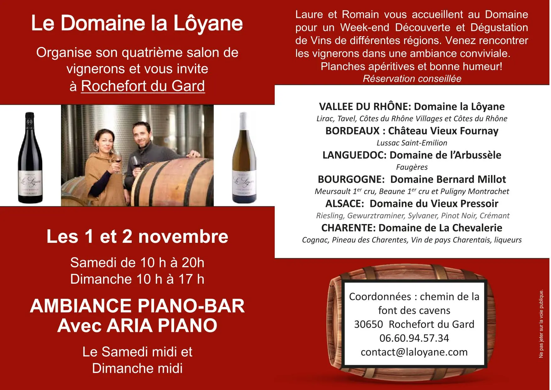 Salon des vins avec rencontre des 6 vignerons de France et dégustation, ambiance musicale Piano-Bar avec ARIA Piano et restauration légère.